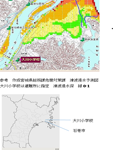 この小学校自体、避難所になっており、生徒の避難先は高台と定めてあったという。雪がある裏山への避難をさけ、川の堤防(6〜7m)に避難をしたが8mの津波に飲み込まれた。遺族側は裏山に避難すると助かったと、市は想定外の大津波で予見できなかったとしたが、防災無線が大津波警報を告げていたため、裁判では市は予見できたと判定した。大川小学校の生徒108人中死亡者68人、行方不明6人。教師13人中死亡9人、行方不明1名の多数の子供たちを失った、悲しい災害事故であった。