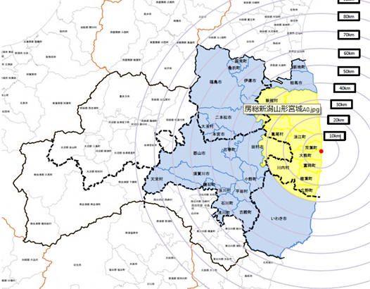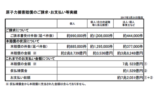 避難者、自主的避難者の人数は公表されていないが想定すると、避難者は「図2避難市町村の住民数」から28万人の数である。自主的避難者は150万人であると報道されていることで、福島県を人口190万人とすれば、実に福島県の人口93%の人が原賠法の対象になる。