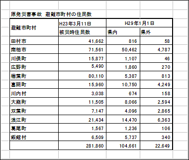 原発避難者数は県内と県外に避難をしている。県外避難者数は39,218で、避難者は22,649、自主的避難者は16、569人となっている。